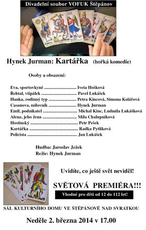 A přijďte na Kartářku! Světovou premiéru této komedie snad přece jenom zvládneme! Takže ve Štěpánově 2. března 2014 v 17.00 hodin.